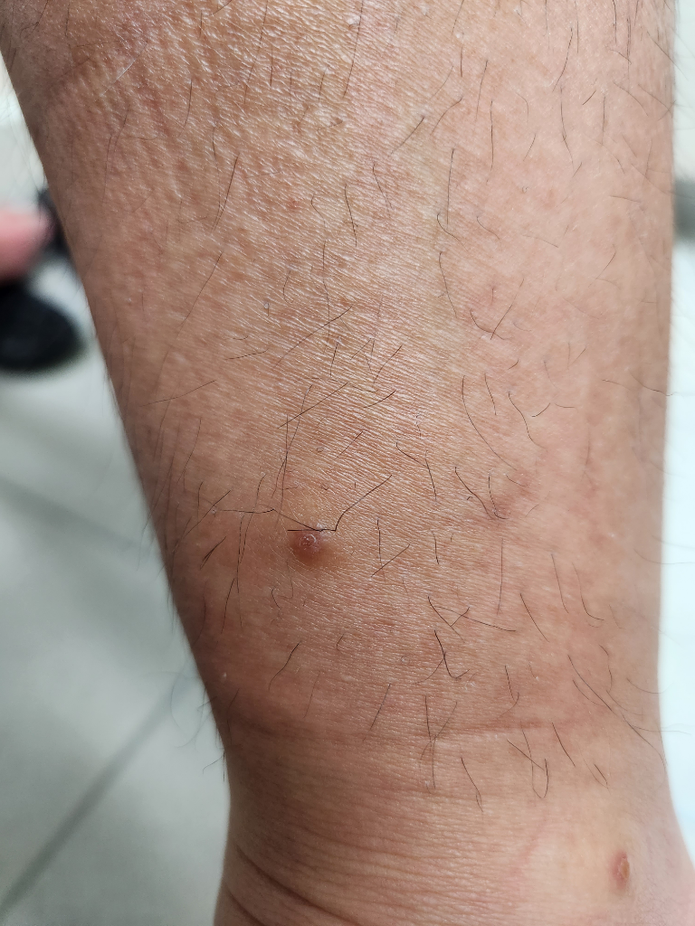 현재로서는 해당 병변 사진만으로 정확한 진단은 어렵습니다. 야외 활동이 있다면 벌레 물림으로 인한 상처일 수도 있으나 먼저 피부과에 내원하시어 정확한 진단을 받아보시는것이 좋겠습니다.