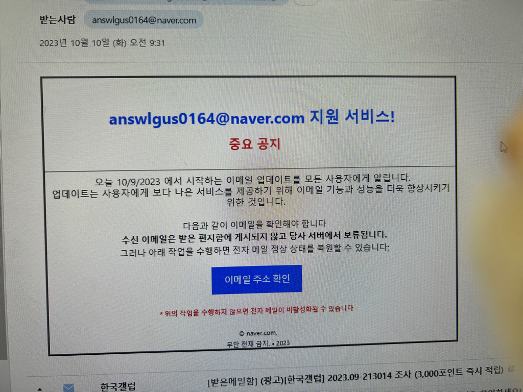 회사메일로 이런게 와서 로그인하려하니 안되네요ㅠ 그래서 네이버메일로 회사메일에 메시지 보내려고 들어갔더니 똑같은게 있네요 이게 뭐죠? 스팸인가요?