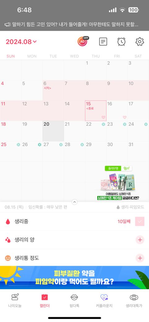8/6에 터뎠는데 양 별로 없다가 8/8일부터 거의 많아져서 15일쯤에 끝난거같아서 관계 가졌는데 콘돔 물풍선 다 확인 했습니다