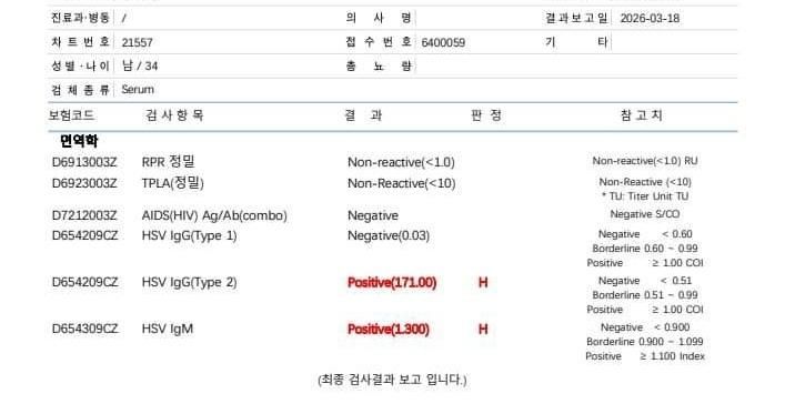이번주 화요일. 즉 5일 전에 헤르페스 2형 수치가 높은 남자와 관계를 가졌는데 아침에 2-3분 정도 노 피임을 하고 가졌구요.