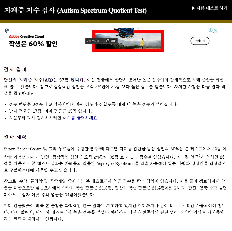 그런데 최근에 인터넷 찾아보면서 제가 아스퍼거 증후군 증상과 70~80%이상 일치하고, 인터넷 검사를 해보니 역시 높은 점수가 나오더라구요. 실제로 그 영향인지 5년째 가족말고 아는 지인이나 친한친구조차 한명도 없이 지내는중이기도하구요