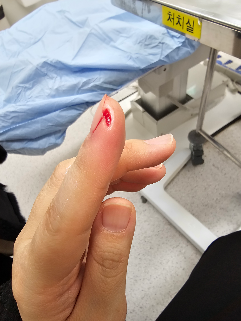오늘 낮 2월 4일 일요일 12시경 칼에 두번째손가락 손톱과 살점이 떨어져나가서 계속해서 피가멈추지않아 응급실을 갔습니다.