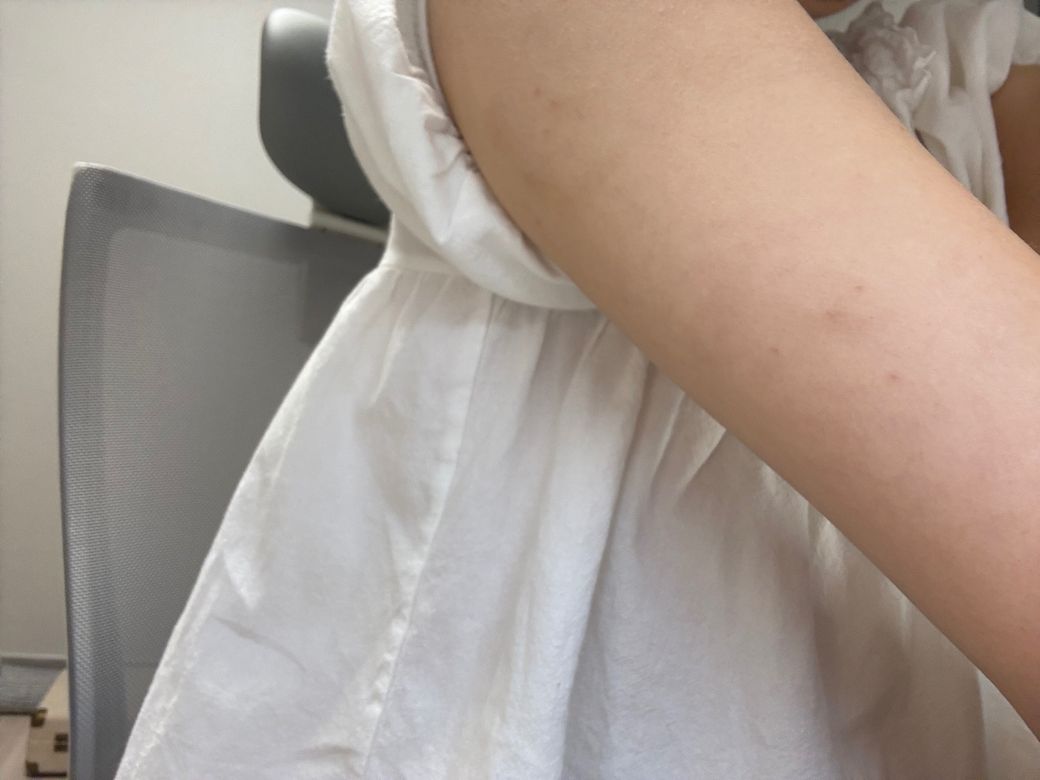 6주에 걸쳐 5번 맞은 자국과 테이프 착색 자국이 생겼어요