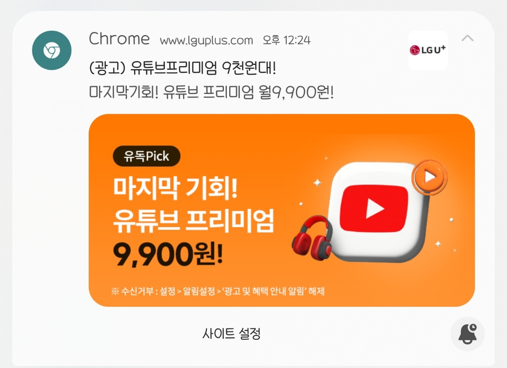 첨부한 사진처럼 모바일 크롬 웹 브라우저에서 이렇게 광고가 날라옵니다. 매번 광고가 와서 불편한데, 이러한 광고 알림은 어떻게 해제할 수 있나요?