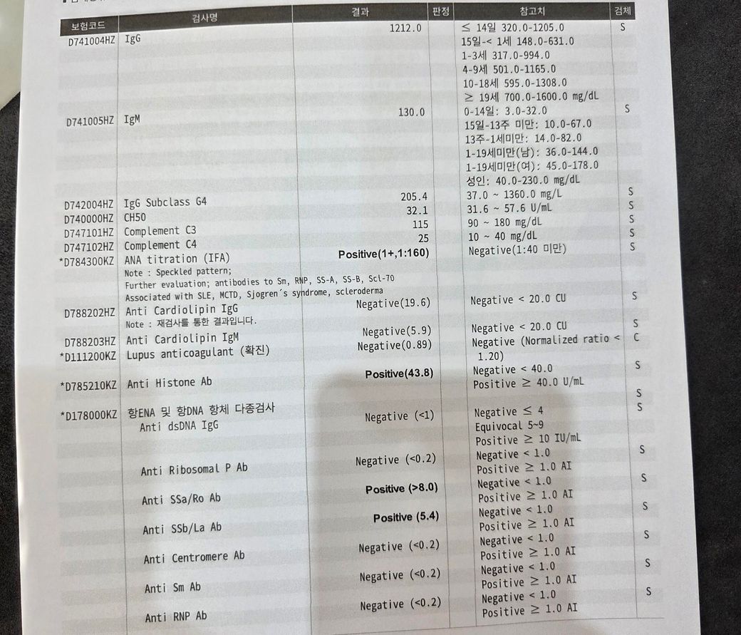 다만 Anti-SSA(Ro)와 Anti-SSB(La)가 양성입니다. 이 항체는 소아에서 드물지만 쇼그렌증후군, 루푸스, 또는 무증상 보유 상태로 나타날 수 있습니다. 특히 무증상 ANA 양성 소아 중 일부에서 단독 SSA 양성이 관찰되기도 합니다. Anti-histone 항체도 양성이며, 이는 약물유발 루푸스에서 흔하지만, 소아에서 약물 노출이 없다면 비특이적 양성일 가능성도 있습니다.