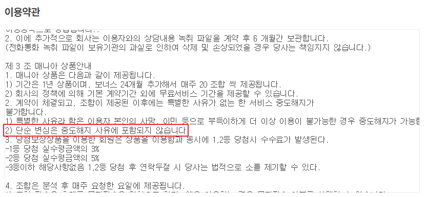 가입 날짜가 아직 7일이 되지 않았습니다. 환불을 요청하고 싶은데, 이용 약관에 "튻별한 이유 없이 중도 해지는 불가능합니다." 라는 문구가 있습니다. 조합은 통화 끝나자마자 문자로 날라와서 뭐 안받을 틈이 없었습니다.