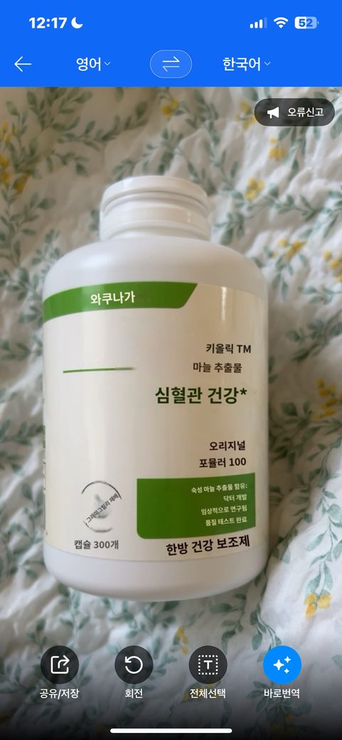 해당 제품은 와쿠나가 회사의 쿄릭 숙성마늘 성분입니다. Take two tablets with a meal twice daily 라고 적혀있는 제품이며, 이는 아침2알, 저녁2알로 하루 총 4알 섭취를 말하는 것입니다.