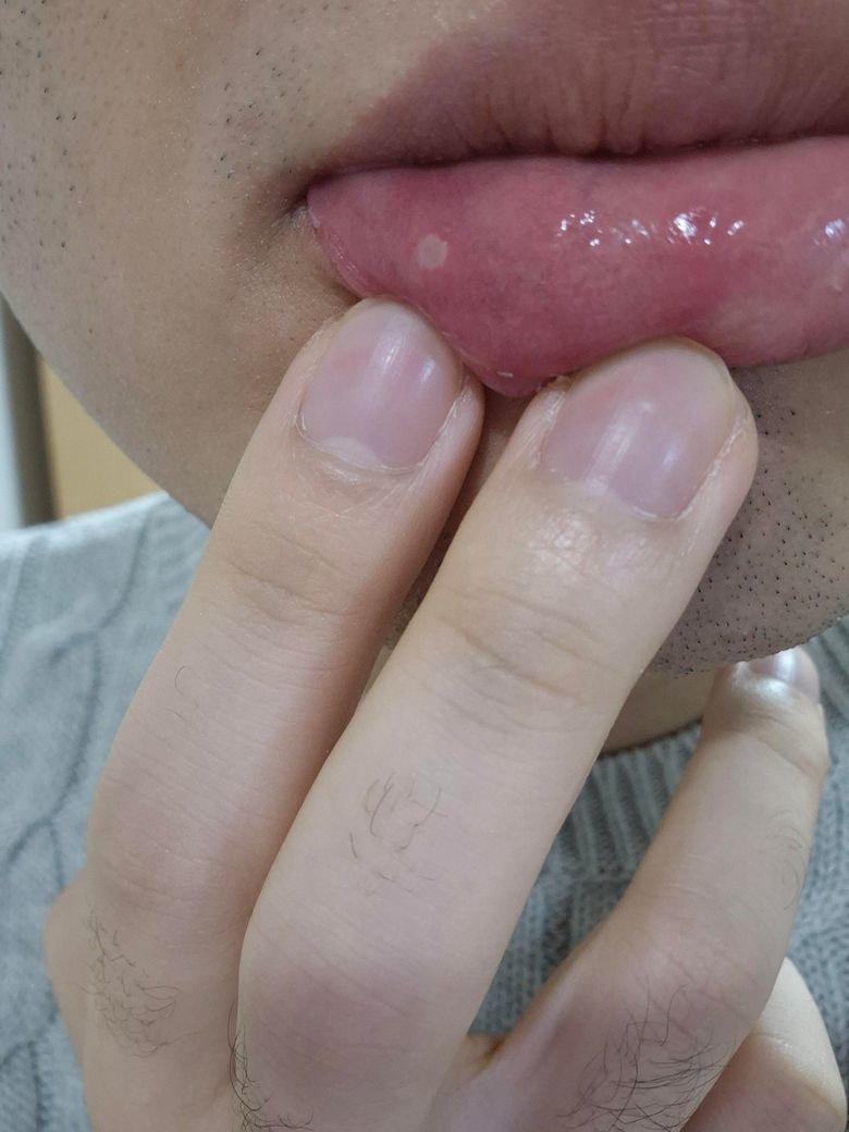 2일전에는 첫번째 사진처럼 별로 안심했는데 어제보니까 갑자기 사진처럼 하얗게 되었는데 구내염같거든요...근데 이게 헤르페스 구내염인지 아프타성 구내염인지 모르겠어요 이거 헤르페스 구내염인가요??