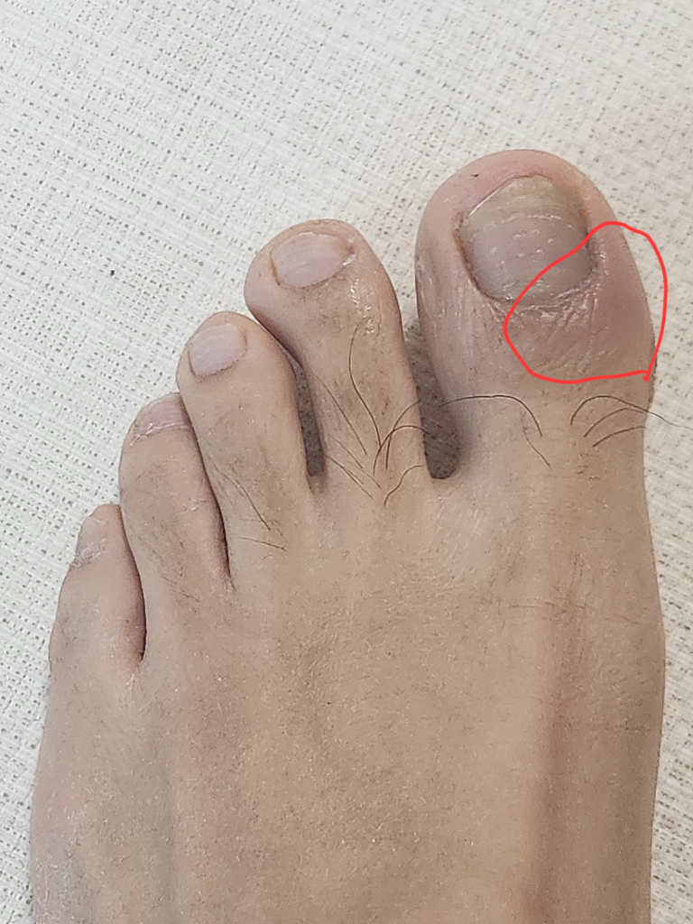발톱주위염이 발생한 상황인데, 내성발톱은 보통 발톱의 옆쪽으로 염증을 유발하지만 지금은 발톱 뿌리부근까지 염증이 번져있는 상황입니다. 원인이 무엇이 되었건 항생제치료를 고려해야 하겠으니 정형외과를 방문해보시기 바랍니다.
