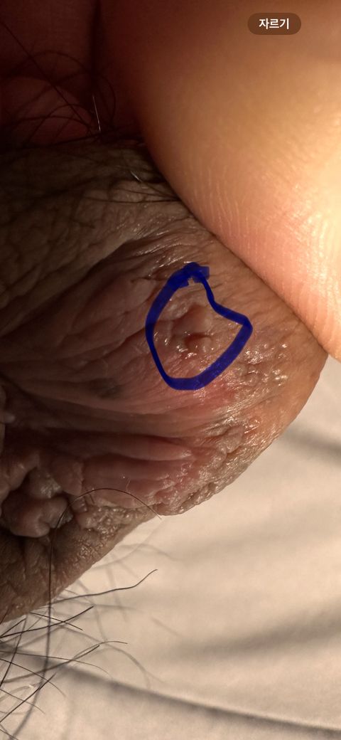 포경수술 경계부? 살짝 위쪽으로 저런 구진이 2개있습니다. 발견한지는 5년 된거 같고 크기변화 여부는 잘 모르겠습니다. 가려움이나 이런건 따로 없습니다.