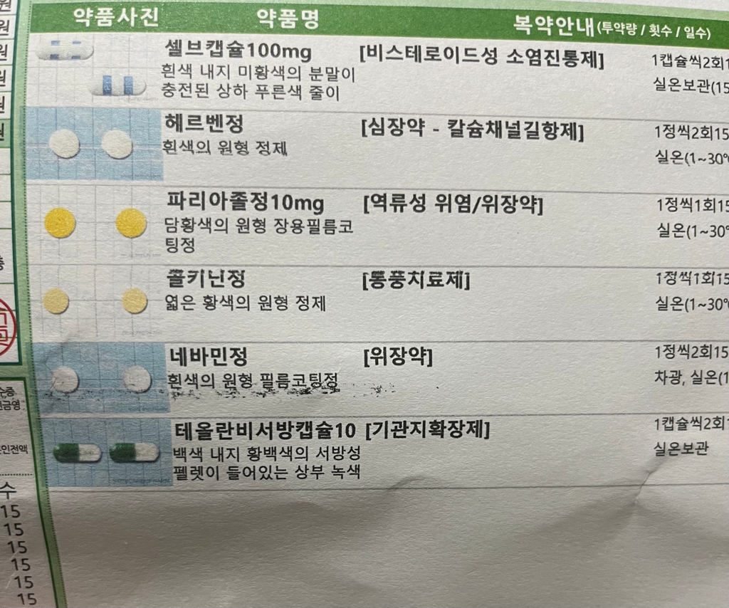 3. 복용 방법을 지키지 않아서 위장장애 발생한 것은 아니고, 원래 콜키닌이나 셀브캡슐과 같은 약은 위장장애 발생할 수 있습니다.