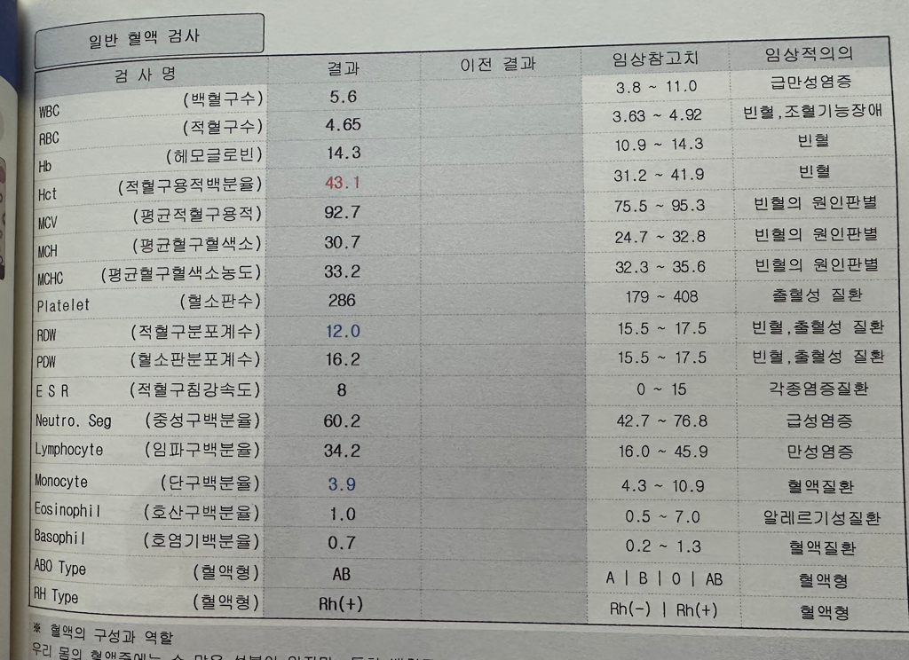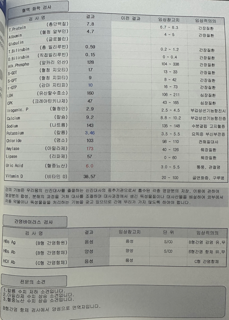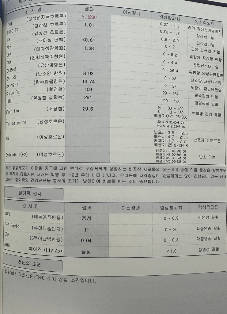 amylase 와 TSH 가 참고범위를 벗어난 것으로 나타났지만 특별한 이상을 시사한다기 보다는