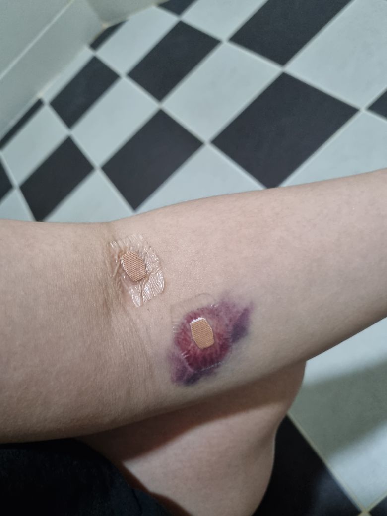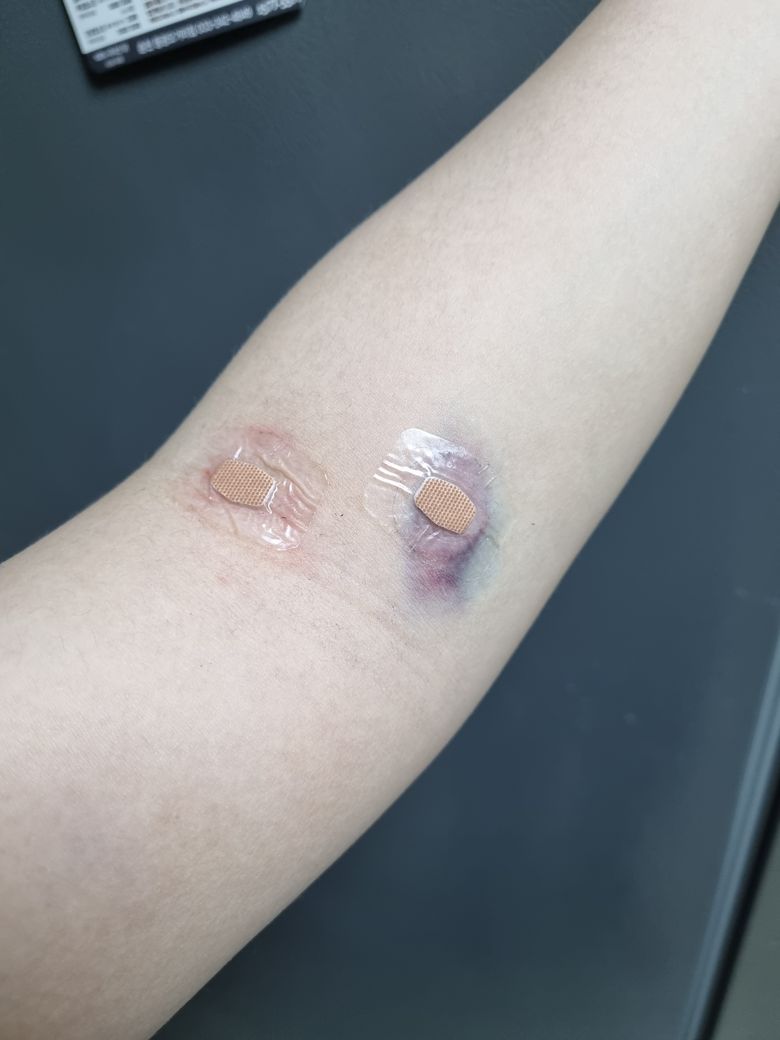 한번도 제 혈관을 못찾는다던가 잘 못찌른다던가 할 만한 그런 팔이 아닌데 컨디션이 많이 안좋았는지 혈관도 잘 안나오고 겨우 나와서 첫번째 찔럿더니 제가 봐도 알겠더라구요 찌르자마자 관통한 것도 아닌데 그냥 맥없이 터지는게...ㅜㅜ