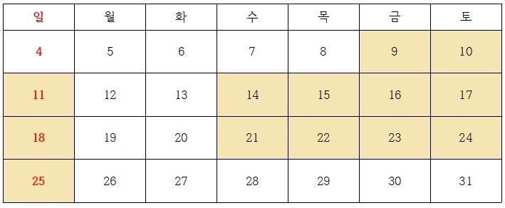 노란색이 근무일자이고 하얀색이 휴무일입니다.