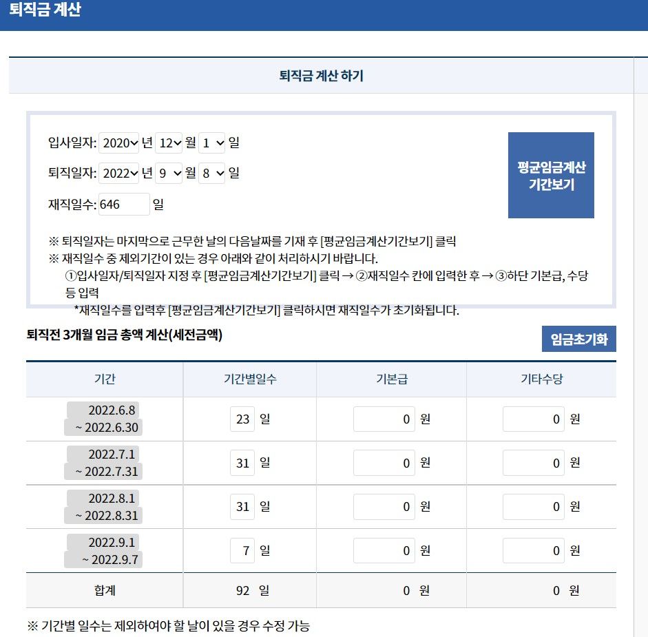질의의 경우 퇴직일자가 2022년 9월 8일이라면 2022년 6월 9일로부터 2022년 9월 8일까지 지급된 임금총액을 기준으로 평균임금을 산정하여 퇴직금이 지급되어야 할 것으로 판단됩니다.