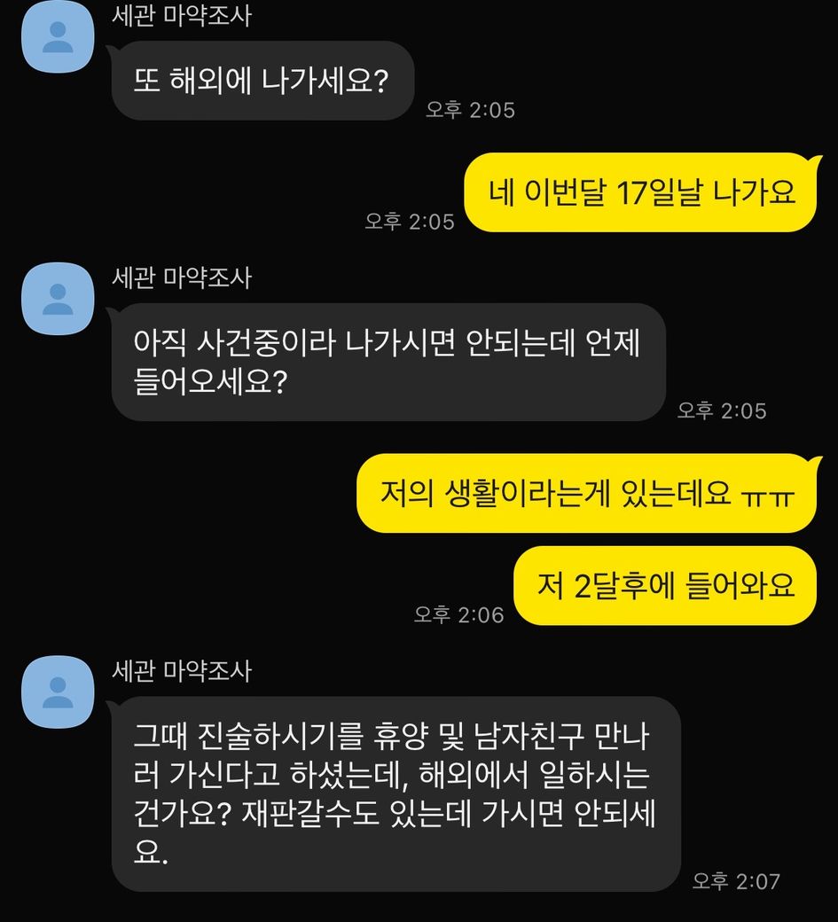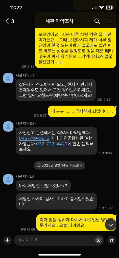 여행 후 한국 입국할때 정신과약(한국처방) 세관에 걸려서 마약밀수로 조사받았습니다.