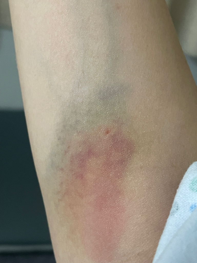 혈액이 주변으로 누출이 되고 나서 멍도 생기고 염증도 동반된 것으로 보입니다. 찜질을 해주어서 증상을 가라앉히고 관리해줘 보시길 권고드리며 차도가 없거나 점점 심해진다면 피부과 등 병원에서 치료를 받아야 할 수도 있겠습니다.
