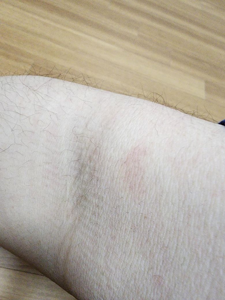 사진상으로는 주사 부위 주변에 국소적인 갈색 변색과 약한 홍반이 보이며, 전형적인 주사 후 혈종(멍)이 흡수되는 과정으로 판단됩니다. 급성 염증 소견(심한 부종, 농, 뚜렷한 발적 확산)은 보이지 않습니다.