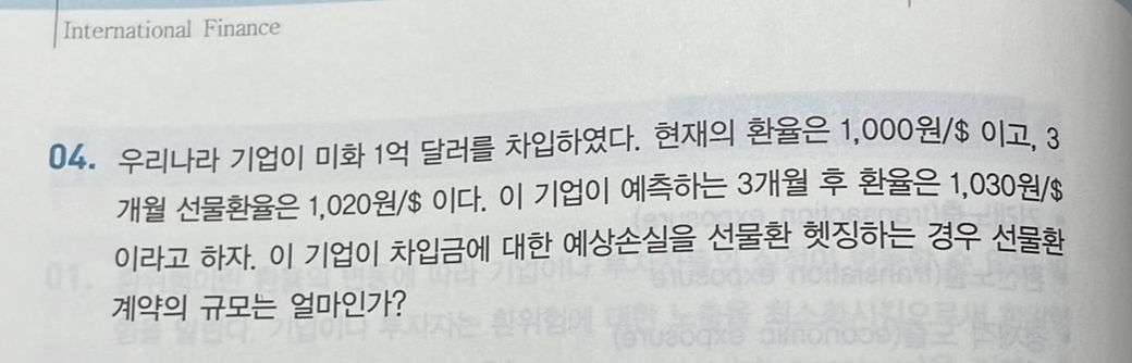 우리나라 기업이 미화 1억 달러를 차입하였다. 현재의 환율은 1,000원/$ 이고 3개월 선물환율은 1,020원/$이다. 이 기업이 예측하는 3개월 후 환율은 1,030원/$이라고 하자. 이 기업이 차입금에 대한 예상 손실을 선물환 헷징하는 경우 선물환 계약의 규모는 얼마인가? 라는 문제에서 답과 풀이를 알려주세요 ㅠㅠ