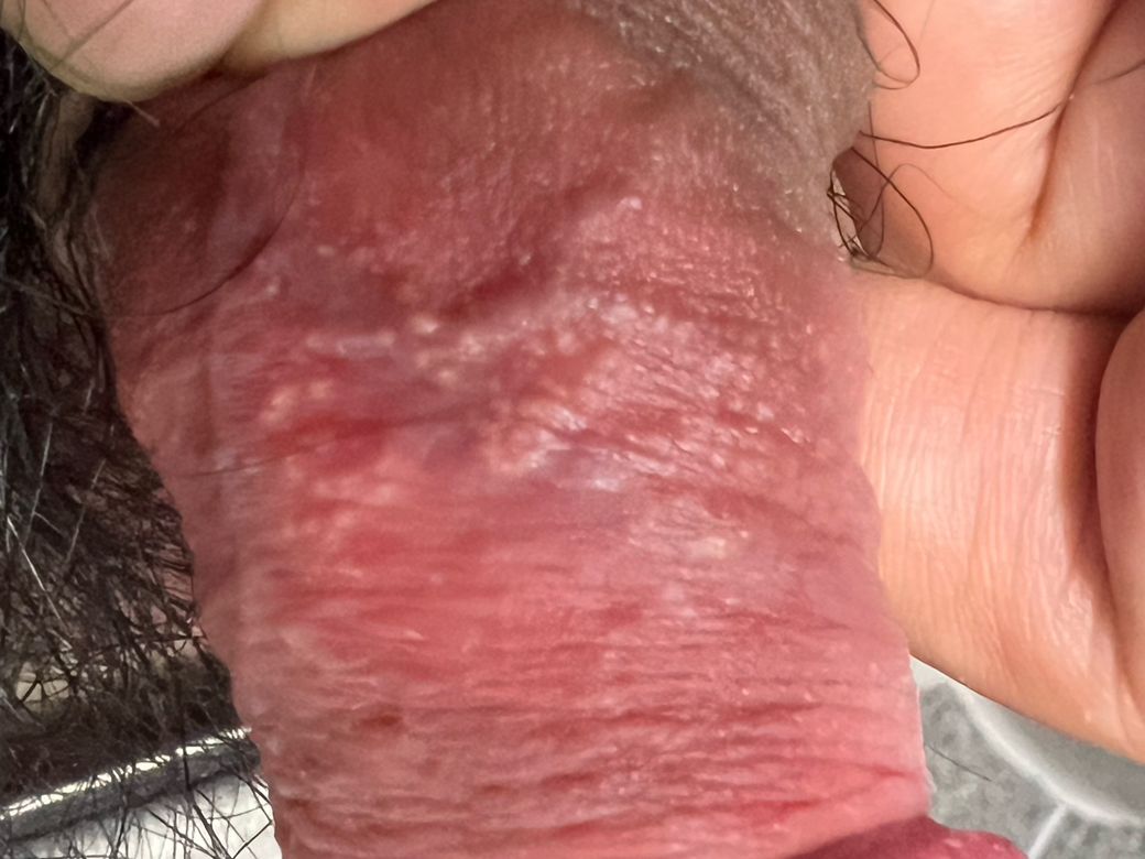 귀두 바로 아래 부분에 사진 상으로는 잘 안 보이지만 흰색 좁쌀? 같은 것들이 있습니다.
