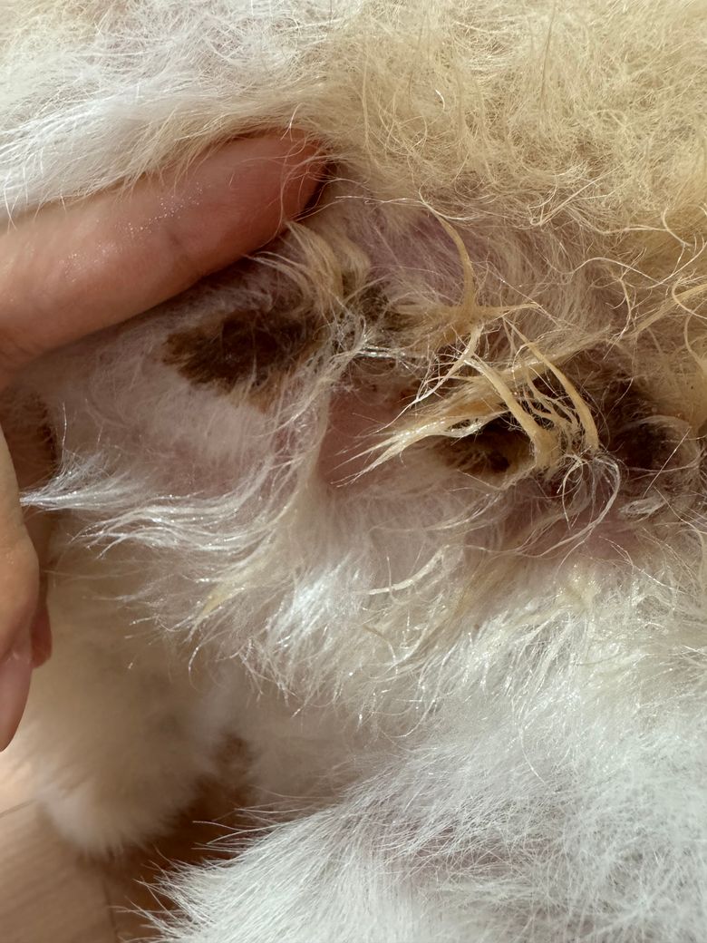 현재 피부병이 확인되어 제모기로 환부와 그 주변털들 다 밀어주시고 상태 확인해볼 필요성이 있습니다.