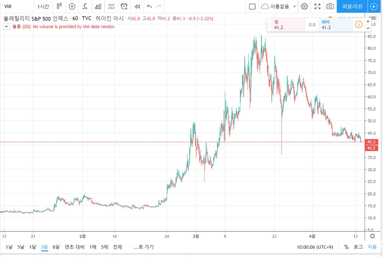 4월14일 기준 최근 3개월 S&P 500 VIX지수