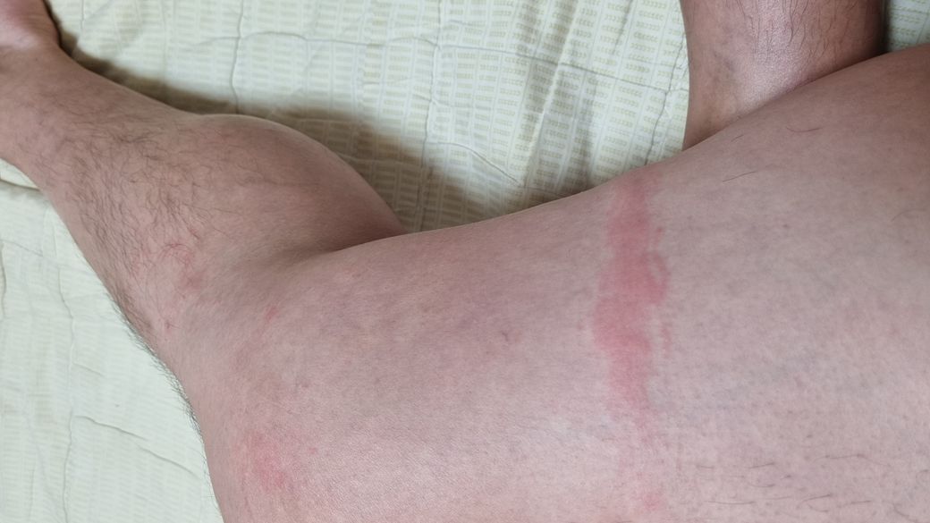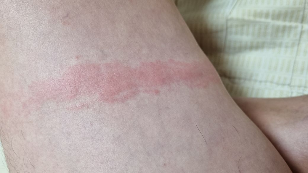 띠모양의 두드러기는 긁어서 발생한 피부묘기증으로 보입니다. 시원한 얼음마사지등으로 가락앉는다면 피부묘기증일가능성이 높습니다. 가라앉지않는다면 피부과 진료를통하여 확인을 해보셔야 합니다.