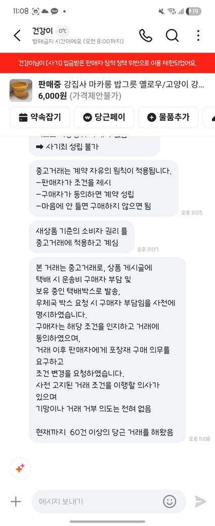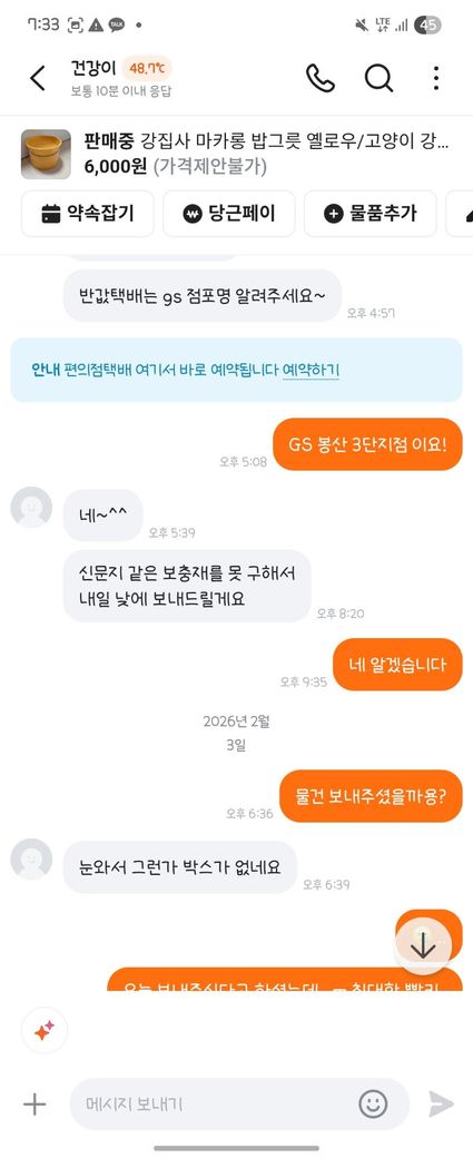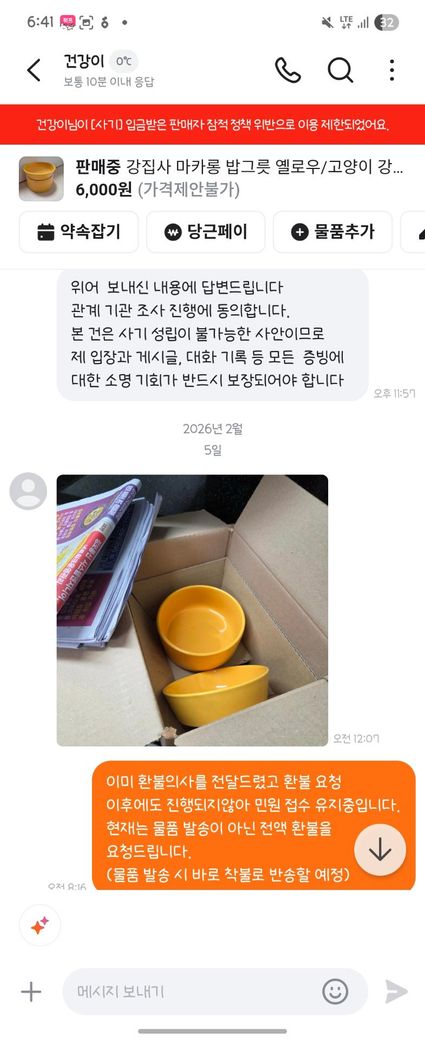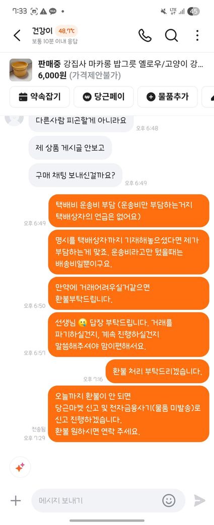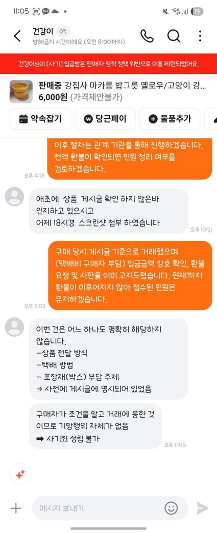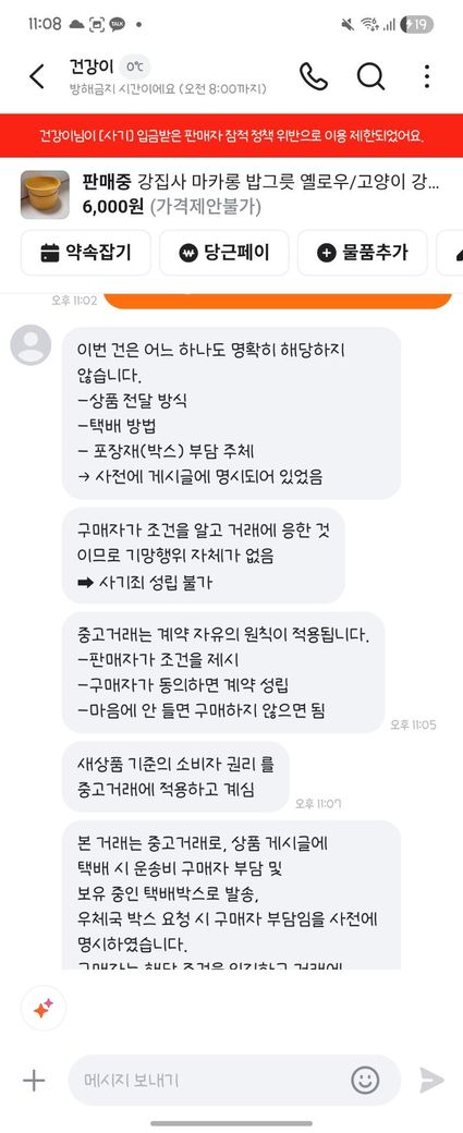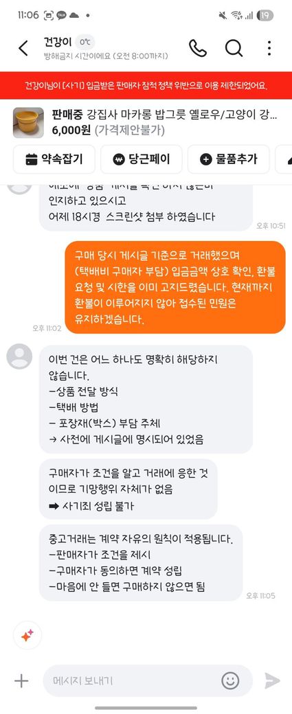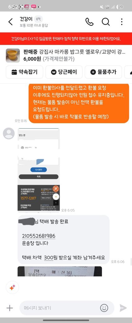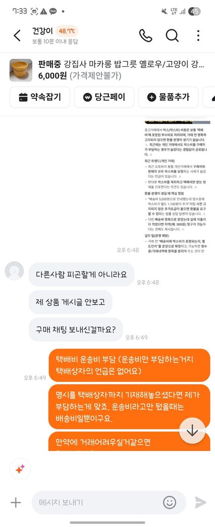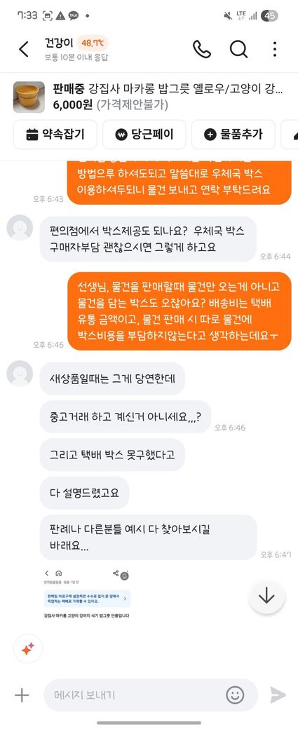 6. 판매자는 우체국 택배 상자 비용을 부담하면 보내주겠다고 함.