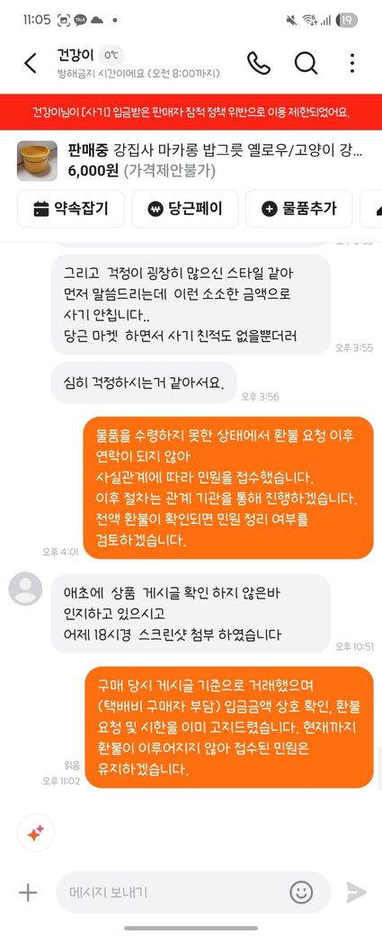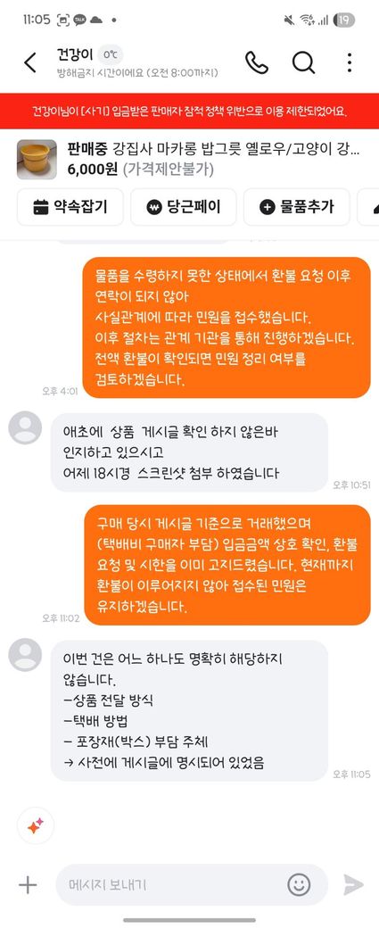 저는 전액 환불을 요구하였으며 일방적으로 물건을 보내면 저는 어떤 사후 행동을 하는게 좋을까요? 조언 부탁드립니다.