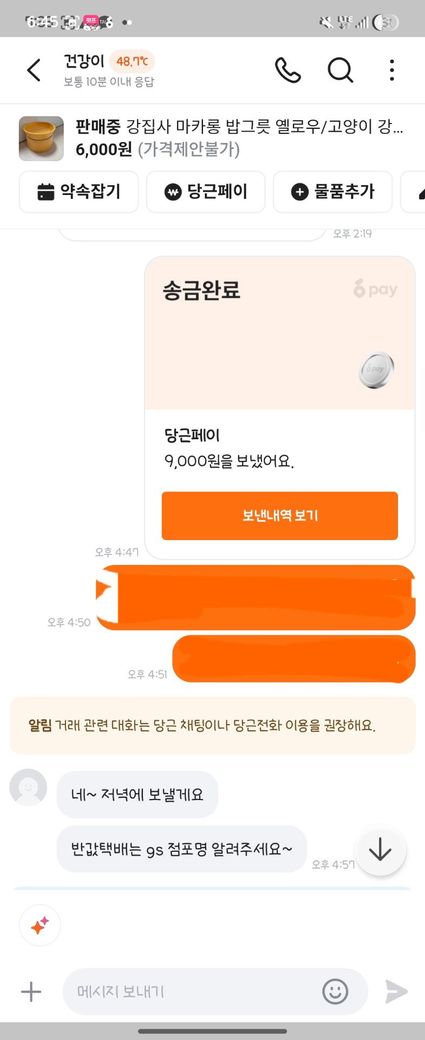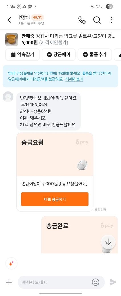 참고로 거래금액은 6000원 + 반값 택배비용 3000원 입니다.