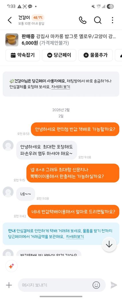 1. 2월 2일(월) 판매자(건강이)에게 구매자(열미)가 물건값과 편의점 반값택배비용 당근페이 입금