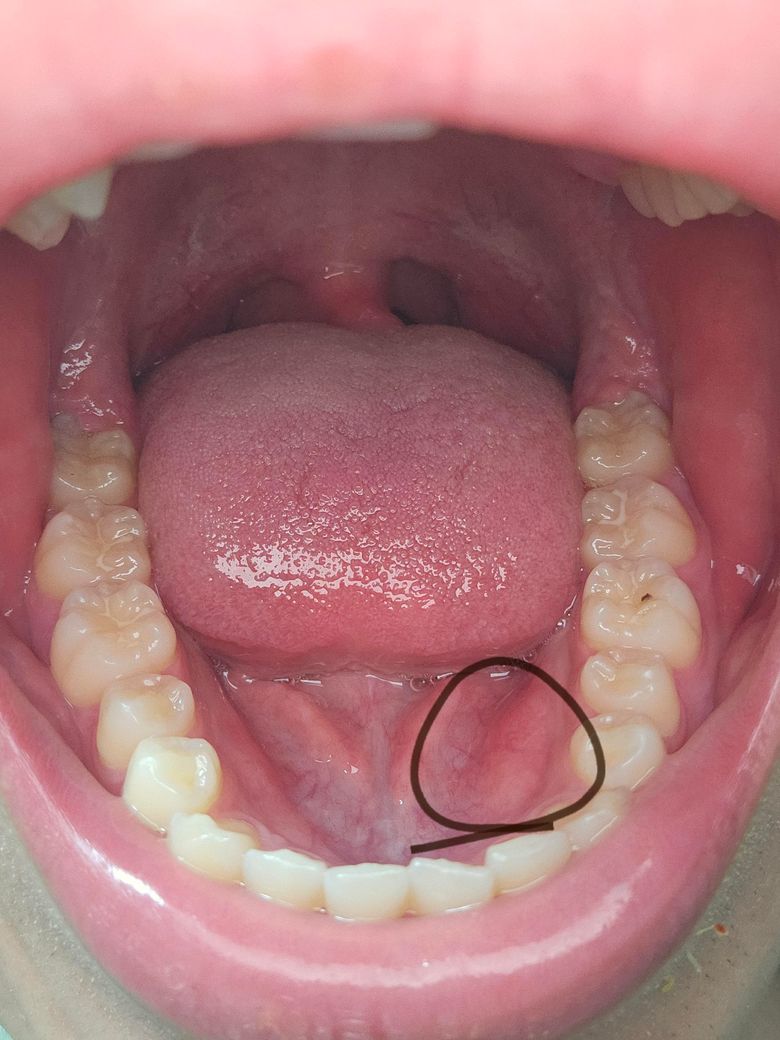 위치상, 아주 딱딱하게 느껴진다면 하악골융기(mandibular torus)가 맞을 것으로 예상됩니다. 그냥 정상 뼈 구조이고요. 걱정하지 않아도 됩니다. 추후 틀니를 하게 될 경우 해당 부위가 틀니에 눌려서 아플 수 있는데 그렇다고 지금 제거할 필요는 없습니다.