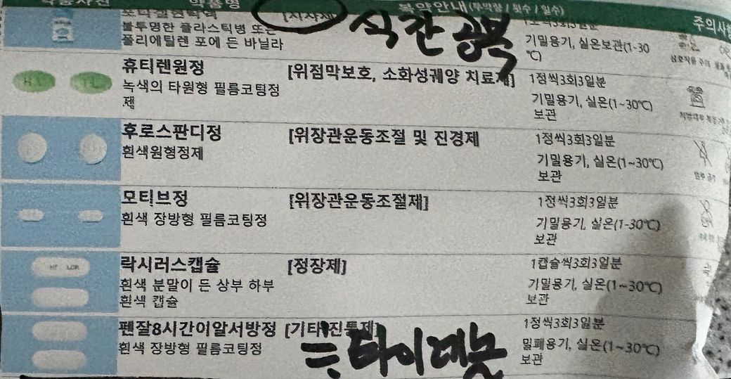 약 처방은 토요일에 받았고, 배가 너무 불편해서 오늘 오전에는 약을 먹지 않았는데