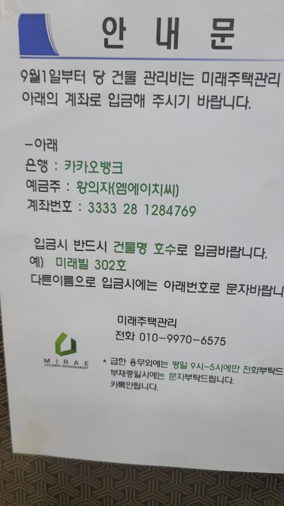 집주인이 아닌 다른사람이 관리비를 다른 계좌에 입금해달라는 공지가 오피스텔에 올라왔어요