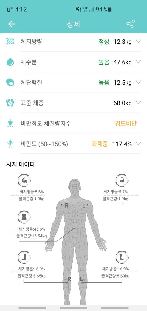 오늘 인바디를 사서 재봤는데 이렇게 나오는데