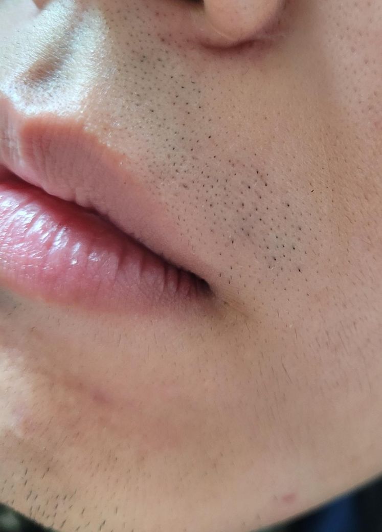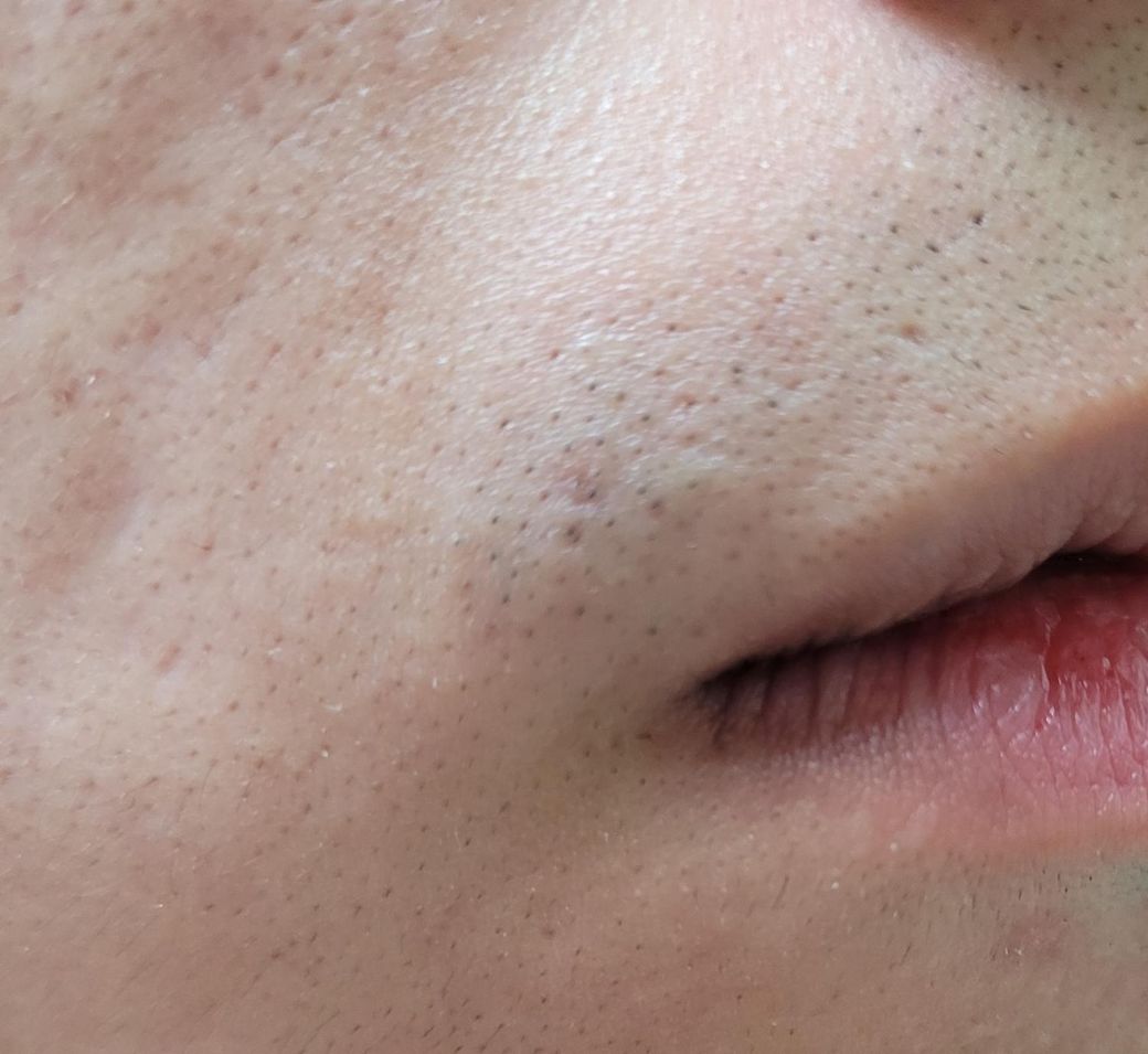 인중엔 뭔가 흉터같은 느낌의 피부가 약간 내려간 듯한 것도 있구요...그쪽에서 화끈거리는 것도 있는것 같고 일단 인중 양쪽에서 자극이 느껴집니다.