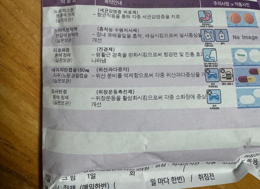 처방 받으신 약들 중 알약들(노르믹스정, 티로파정, 네이자틴캡슐 150mg, 모사틴정)은 식사와 상관없이 복용하실 수 있는 약입니다. 따라서 현재 식사를 하고 싶지 않으신 상황에서 공복에 약을 복용하셔도 괜찮습니다.