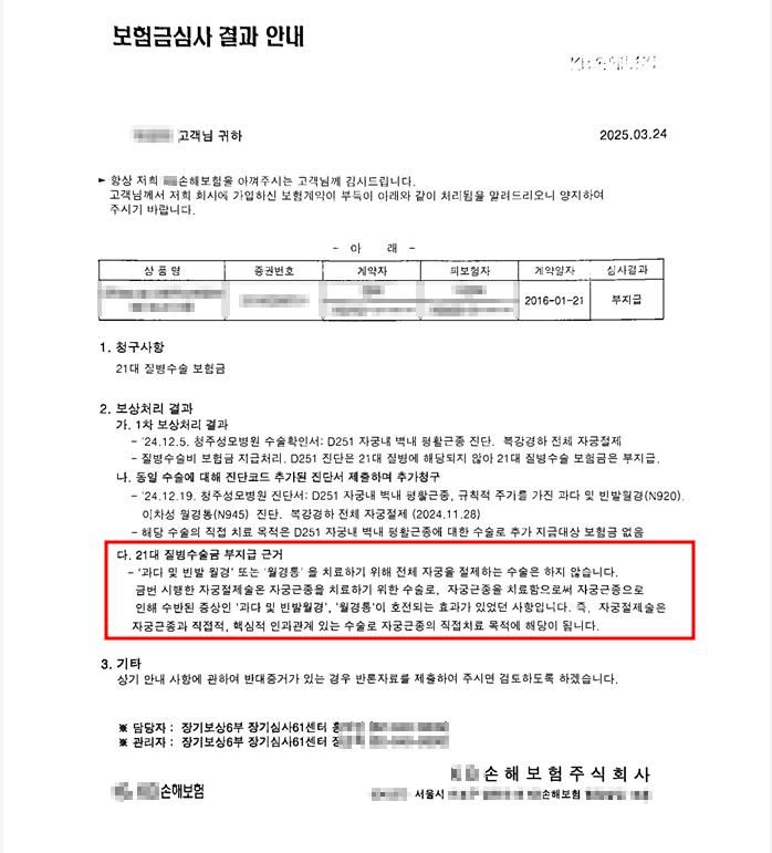 거절사유는 3가지 질병 진단후 수술받으셨지만, D25가 주상병으로 되어 있어서 보험금 지급을 할 수 없다고 함. N92 와 N94를 직접 치료하기 위해 수술한게 아닐 수 있다고 함.