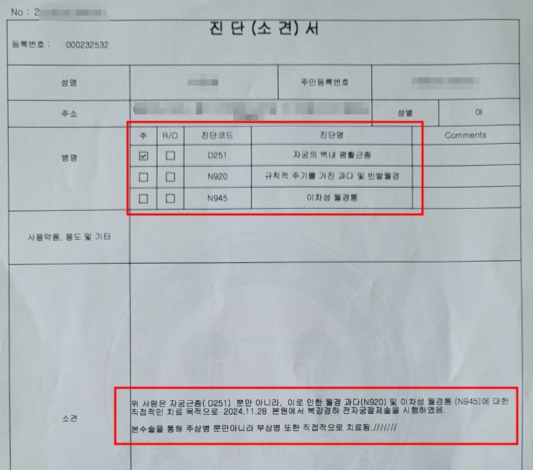 : D251, N920, N945 진단을 받으시고 자궁 전체를 절제하는 수술을 받으심.