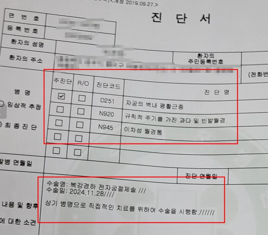 (참고로) 과다월경으로 약물치료, 기구삽입치료 등을 받다가 최종 호전이 안될때는 환자의 나이 및 환경을 고려해 자궁적출수술을 최종적으로 판단해서 한다고 대한산부인과학회 학술지 및 질병관리청 자료는 찾았습니다^^ 이의신청시 첨부하려 합니다.