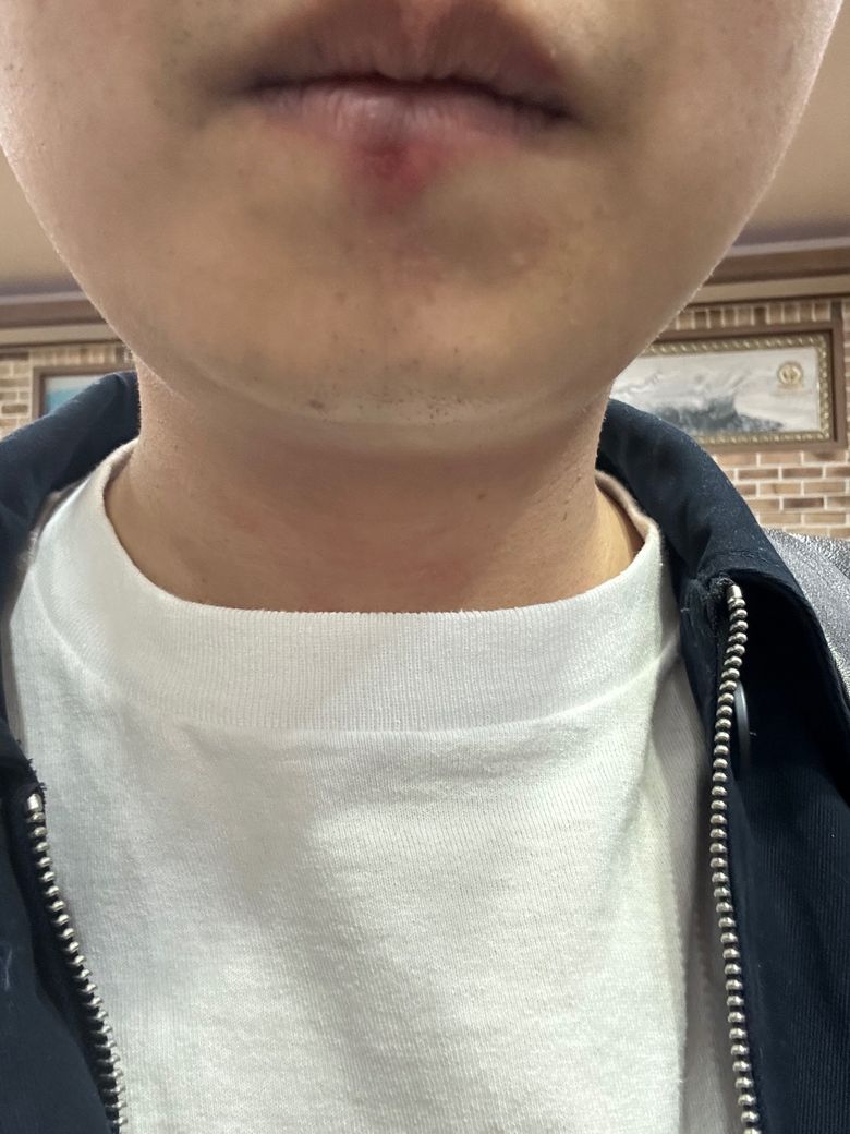 사진상으로는 아랫입술 중앙에 국소적인 붉은–보라색 변색과 자극 증상이 보입니다. 물집은 뚜렷하지 않고, 3일 경과했다는 점을 고려하면 가장 흔한 가능성은 두 가지입니다. 하나는 단순 접촉성 자극 또는 건조로 인한 입술염이고, 다른 하나는 초기에 물집이 지나간 뒤 남은 헤르페스 단순포진 초기 병변입니다.
