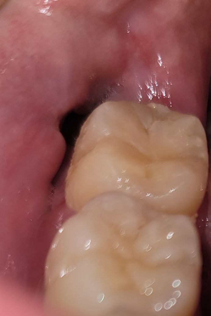 사랑니 뽑은 부위에 구멍이 생겨 어둡게 보이는 것으로 보입니다. 몇달에 걸쳐 살이 점점 차 올라오면 구멍도 없어집니다.