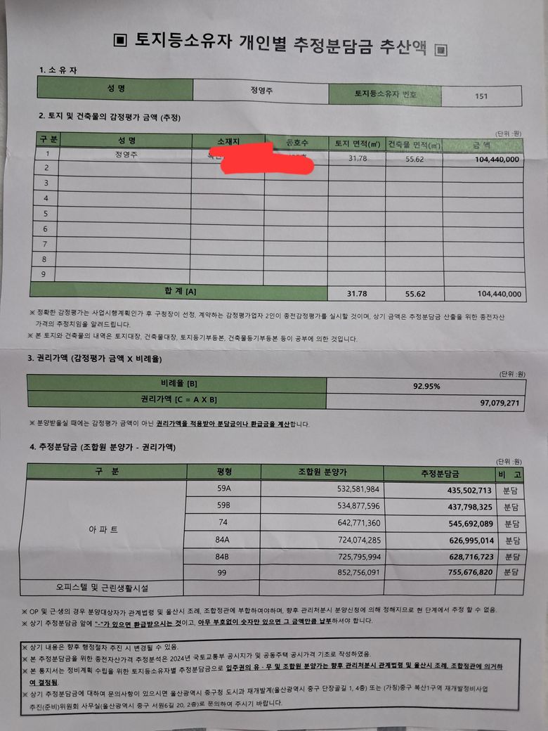 토지소유자개인별추정분담금이있는데