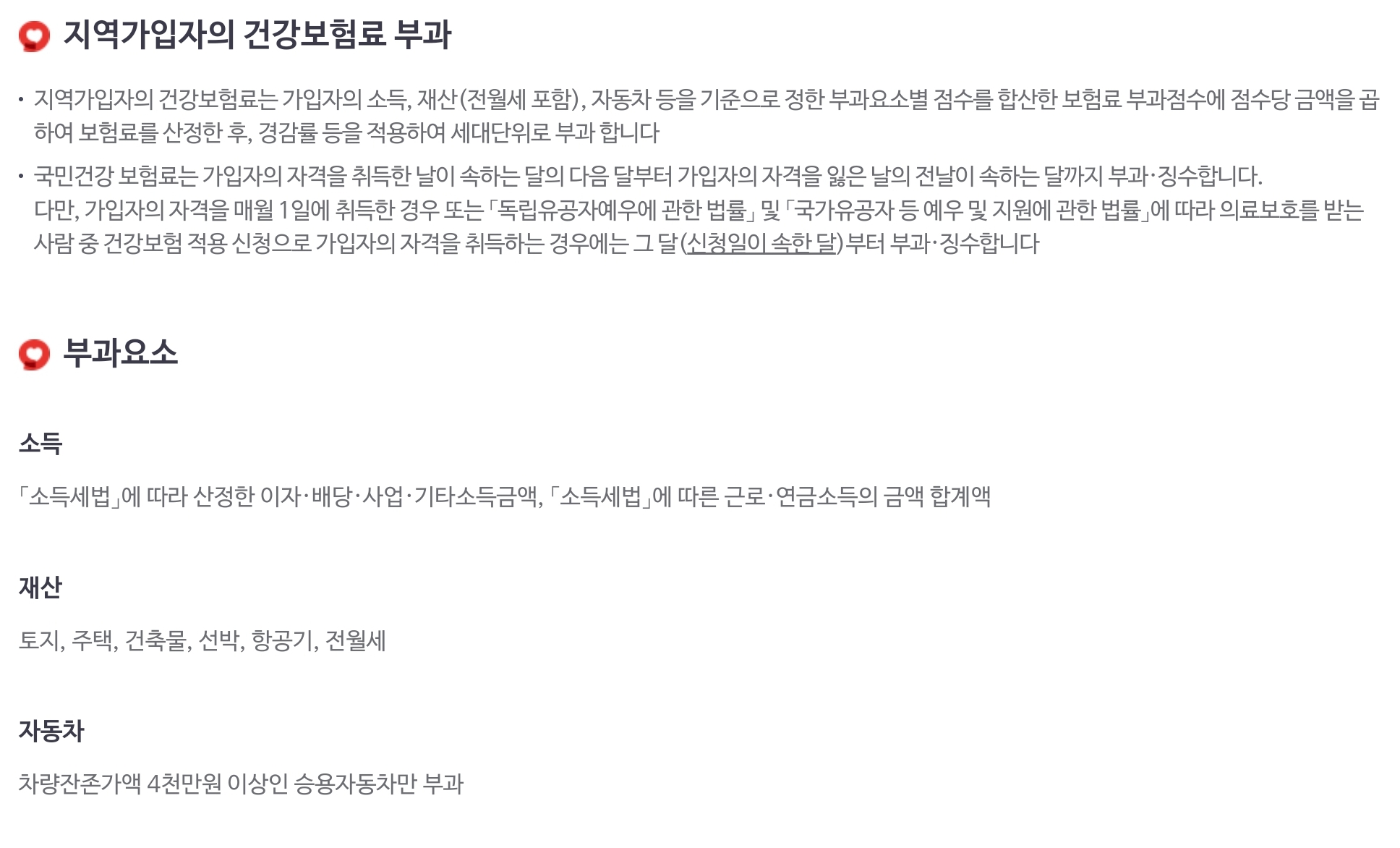 지역가입자의 건강보험료는 가입자의 소득, 재산(전월세 포함), 자동차 등을 기준으로 정한 부과요소별 점수를 합산한 보험료 부과점수에 점수당 금액을 곱하여 보험료를 산정한 후, 경감률 등을 적용하여 세대단위로 부과 합니다