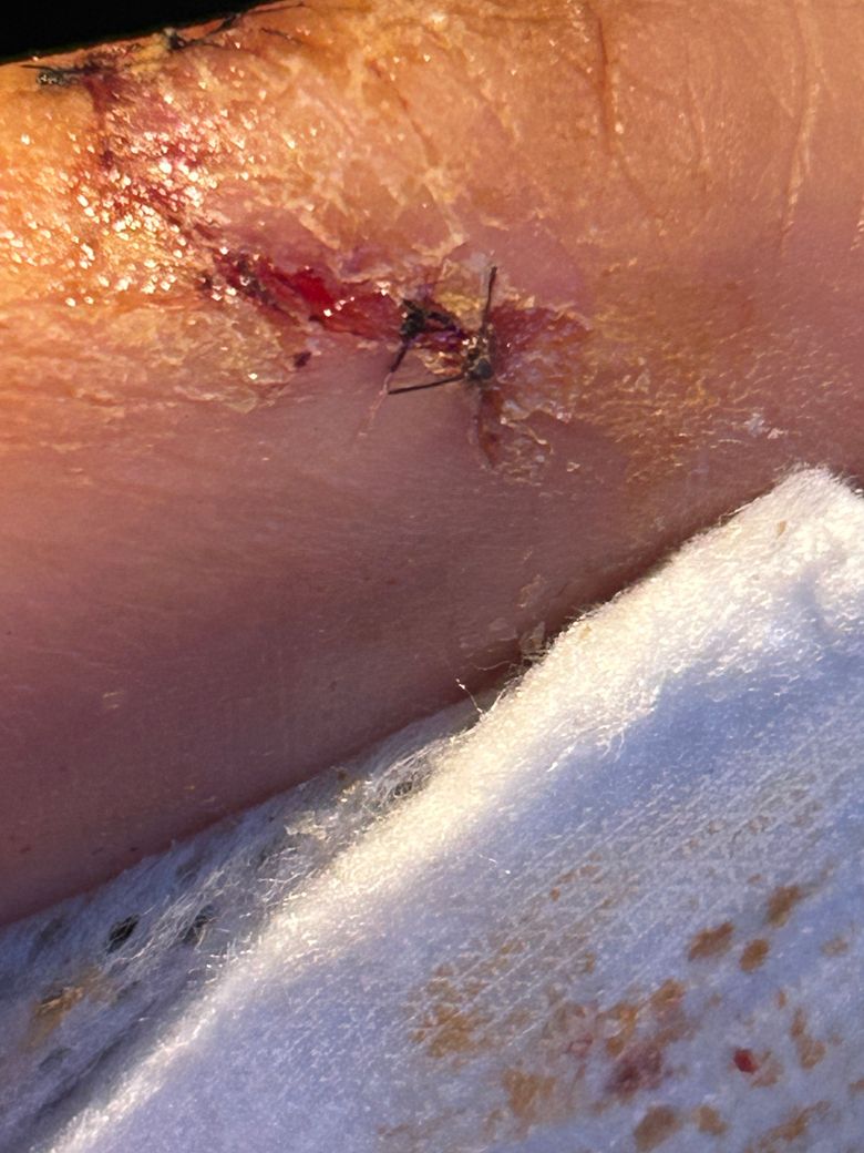 손가락 아닌가요? 구부리지만 않고 소독만 잘 하면 될 것 같습니다. 상처가 약간 벌어져 있기는 해도 회복에 문제가 될 정도는 아닌 것 같습니다. 만약 계속 벌어져 있다면 1바늘 정도만 봉합해도 될 것 같구요.