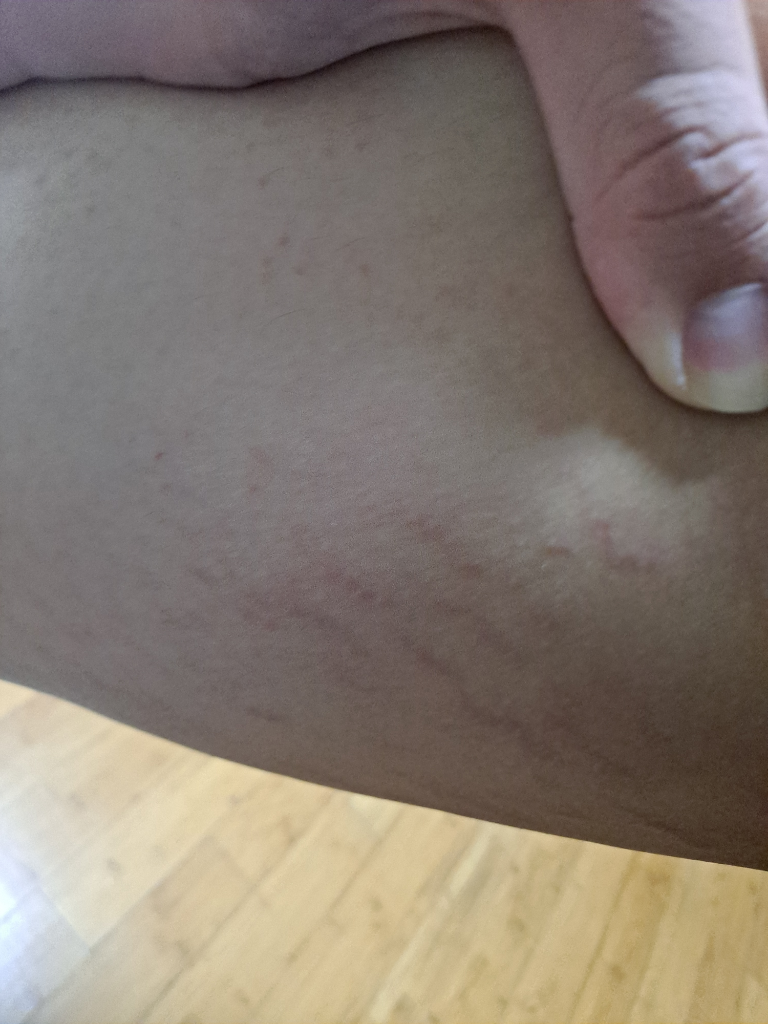 팔과 허벅지에 나타난 것들은 사진을 보았을 때에는 멍보다는 튼살자국으로 보입니다. 문제를 일으키지는 않지만 미용 목적으로 제거하는 경우가 있는데, 이때는 레이저 치료 등을 해볼 수 있겠습니다. 물론 눈에 자주 띄지 않는 곳이라 내버려 두어도 됩니다.