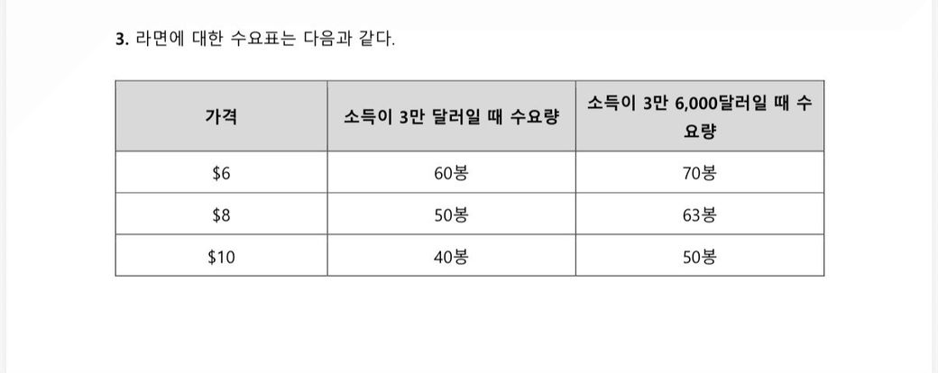 a.중간점 공식을 사용해서 라면 가격이 8달러에서 10달러로 상승했을 때 (i) 소득이 3만 달러일 때, (i) 소득이 3만 6,000달러일 때 수요의 가격탄력성을 각각 계산하라.