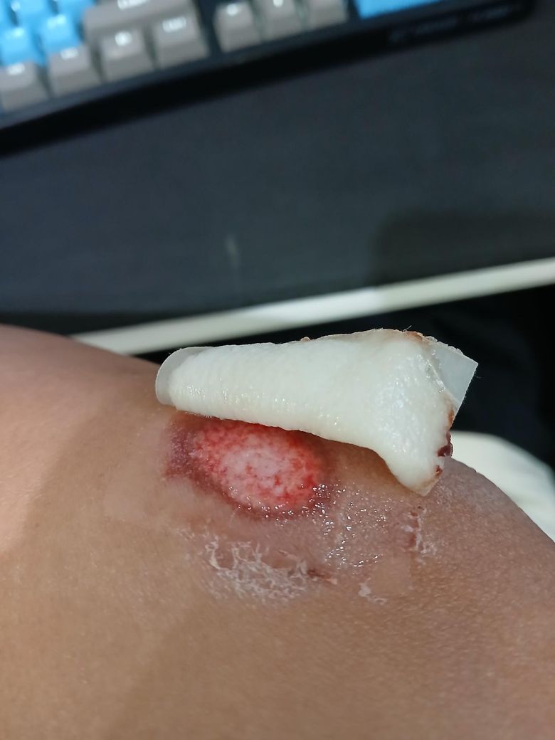 상처 부위에 물이 닿지 않도록 해주시고 세균이 감염되지 않도록 소독 잘 해주시고 거즈나 밴드로 덮어 주시는 것이 좋으며 고름이 발생하거나 통증 등 증상이 심해지신다면 피부과에서 진료를 받아보시는 것을 권해드립니다.
