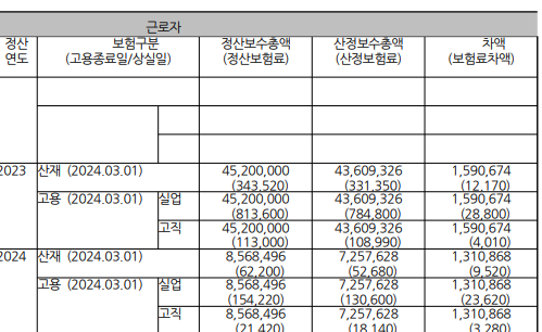 고용보험의 경우 실업이라는 란의 차액을 살펴보시면 됩니다.
