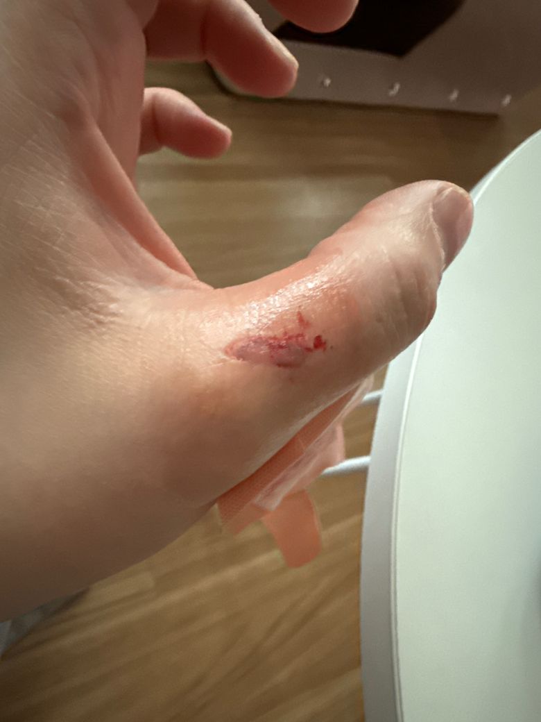 상처를 보면 봉합을 하기는 다소 어려운 상태인 것 같습니다. 일단 소독만 하고 밴드만 잘 붙여서 관리하면 붙을 것 같기는 합니다.